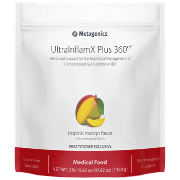 UltraInflamX Plus 360°® is a medical food formulated to provide strategic macro- and micronutrient support for patients with compromised gut function resulting from inflammatory bowel disease, including ulcerative colitis and Crohn's disease. Provided in a proprietary, vegan pea/rice protein base, this formula addresses increased nutrient needs and potential deficiencies in these patients. This formula features CurQfen®, a clinically studied, patented curcumin blend designed for greater bioavailability and more reliable clinical outcomes. It has been demonstrated to result in up to 45.5 times more free curcuminoids in human plasma compared to standard curcumin extract. UltraInflamX Plus 360° also features XNT ProMatrix®–a proprietary protein matrix technology designed to enhance the delivery of a high quality xanthohumol compound for increased bioavailability and stability.